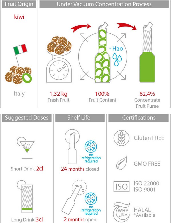 Освен множеството си ползи, кивито чудесно се съчетава с месни деликатеси и сирена. Затова Mixer Пюре от киви, създадено с висококачествени италиански плодове, е идеалната основа за приготвяне на аперитиви и коктейли, които отлично допълват класически мезета и плата.