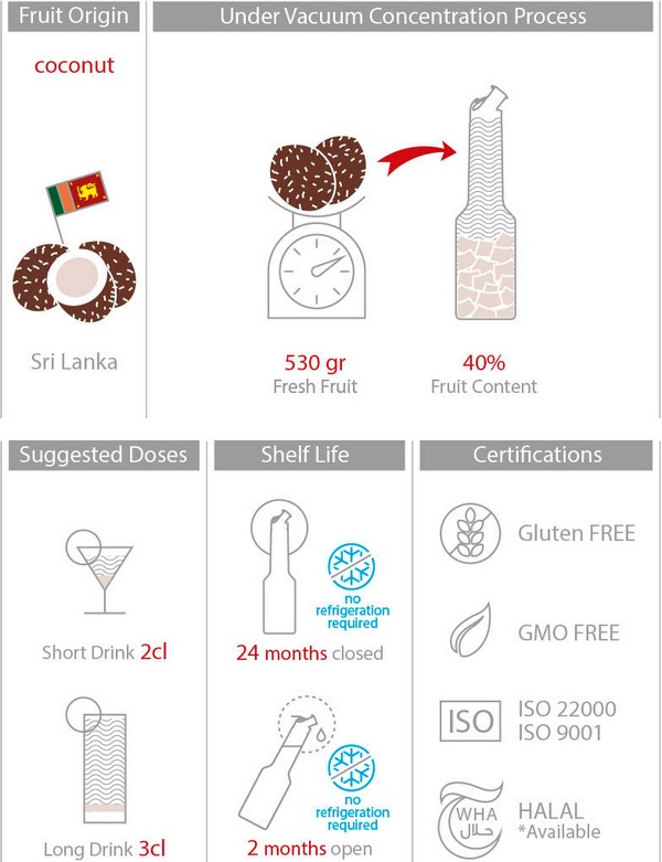 Mixer Coconut е направен от най-добрите кокосови плодове от Шри Ланка. Кокосът се счита за функционална храна, тъй като може да донесе много ползи на тялото и някога е бил известен като дървото на живота. Широко използван в индийската кухня, той има много приложения. Самият плод си остава за италианците символът на лятото на плажа, отпивайки студена Пина Колада и всеки ще ви каже, че Миксер е кралят на коладата!