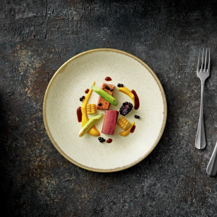 Цветна порцеланова чиния с керамичен вид и леко неравни ръбове в глазурата, без борд.