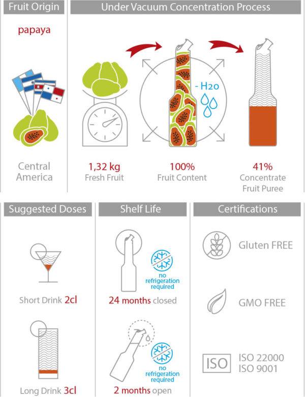 Папаята е чудесен избор за аперитиви – комбинира се прекрасно с битери, джин и тоник, както и в коктейли на основата на ром. Екзотичен плод, който внася свежест, цвят и изтънченост във всяка напитка или десерт.